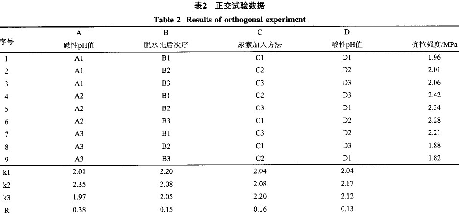 通過(guò)對(duì)影響樹(shù)脂性能的主要因素的分析,并參考此前試驗(yàn)工作的結(jié)果,首先確定了堿性反應(yīng)溫度、時(shí)間,酸性反應(yīng)溫度、時(shí)間,脫水總量,然后選擇甲醛與尿素堿性加成的反應(yīng)pH值、脫水先后次序、尿素加入方法、酸性縮聚反應(yīng)pH值四個(gè)因素,并選擇相應(yīng)的3個(gè)水平進(jìn)行了正交試驗(yàn)。各因素與水平設(shè)計(jì)及結(jié)果見(jiàn)表1和表2,各個(gè)因素對(duì)樹(shù)脂砂抗拉強(qiáng)度的影響見(jiàn)圖1。