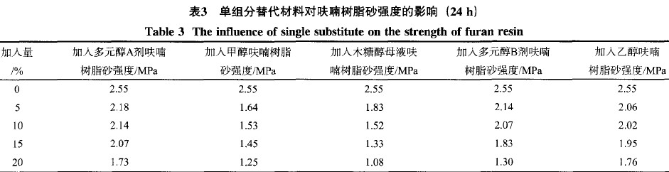 在反應(yīng)后期,通過(guò)改變單一組分替代材料的加入量,研究了單一組分的替代材料對(duì)呋喃樹(shù)脂砂強(qiáng)度的影響,試驗(yàn)結(jié)果如表3所示。