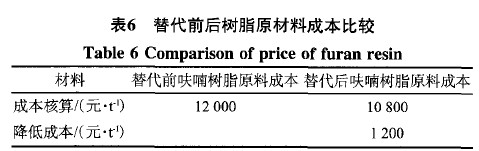 表6是替代前后樹(shù)脂原材料成本比較,從表6可以看出替代后每噸呋喃樹(shù)脂的原材料成本可以降低1200元,下降10%,而呋喃樹(shù)脂每年的產(chǎn)量巨大,所以創(chuàng)造的經(jīng)濟(jì)效益是非??捎^的。