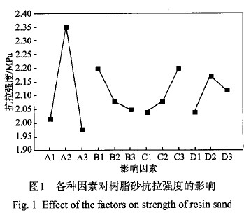 以樹(shù)脂砂24h抗拉強(qiáng)度為考察指標(biāo),通過(guò)很差分析,得出堿性反應(yīng)PH值的影響較大,呋喃樹(shù)脂合成工藝優(yōu)化的結(jié)果為A2B1C3D2。即:堿性反應(yīng)PH值8.5,反應(yīng)前期脫水,尿素分三次加入,酸性反應(yīng)pH值4.1。按此組合進(jìn)行驗(yàn)證性試驗(yàn),取得了優(yōu)化的工藝結(jié)果,樹(shù)脂砂強(qiáng)度達(dá)2.55MPa。
