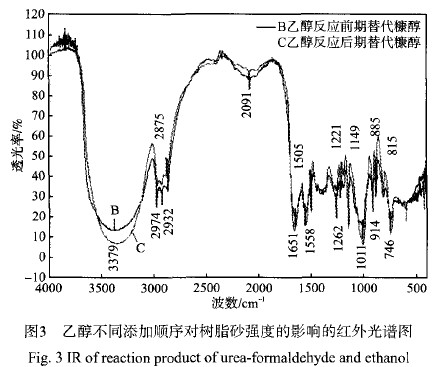 (4)通過(guò)對(duì)紅外光譜的表征分析,部分乙醇在酸性縮聚反應(yīng)時(shí)添加可與羥甲基脲以及糠醇等發(fā)生縮聚反應(yīng),從而得到較好的工藝效果。