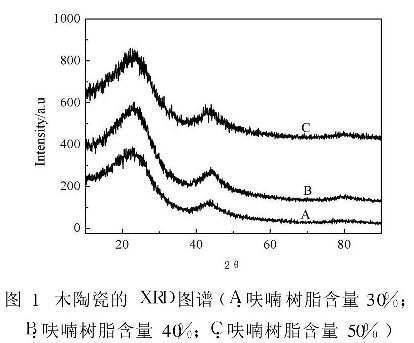 圖1為不同呋喃樹脂含量模壓試樣炭化后制取的木陶瓷的XRD圖譜,木陶瓷是由竹粉炭化后生成的竹炭與呋喃樹脂炭化后生成的玻璃炭構(gòu)成的復(fù)合炭材料。由圖1可以看出,木陶瓷中的XRD譜圖出現(xiàn)了兩個類似石墨的峰,分別是(002)峰與(101)峰,與石墨的特征峰相比峰形較寬,強度較弱且峰形不對稱,表明木陶瓷是由一系列連續(xù)分布的結(jié)晶度低的亂層石墨構(gòu)成,峰形寬說明生成的石墨微晶十分細?。蛔V線呈現(xiàn)出不對稱性,在低角度一邊呈較緩的斜度,在高角度一邊呈較陡的斜度,這表示木陶瓷中含有不同石墨化度的組分,石墨晶體結(jié)構(gòu)較完善的組分,2θ角大,石墨晶體結(jié)構(gòu)不完善的組分,2θ角小。對比ABC三條曲線可以發(fā)現(xiàn),由A到C口隨著原料中呋喃樹脂含量的增加,譜線的峰高略有增大,峰形變化不明顯。
