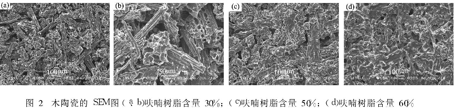 圖2為不同呋喃樹脂含量模壓試樣炭化后制取的木陶瓷的表面形貌照片。由圖2可知高溫炭化后可觀察到的木陶瓷的相主要包括三種:竹炭相、玻璃炭相以及孔隙相,孔隙包括竹粉內(nèi)部的孔隙與竹粉之間的孔隙。由圖2ab可以看出,竹炭具有多孔結(jié)構(gòu),玻璃炭覆蓋在竹炭的表面呈不連續(xù)狀態(tài),對竹炭結(jié)構(gòu)起到了強化的作用,竹炭的形態(tài)結(jié)構(gòu)清晰可見,竹炭之間有較大的間隙;隨著呋喃樹脂含量的增加,炭化后生成的玻璃炭增多,竹炭表面被越來越多的玻璃炭所覆蓋,竹炭之間的接觸面增大,間隙逐步減小,如圖2c所示;到呋喃樹脂含量為60%時,如圖2d所示,生成的玻璃炭呈連續(xù)狀態(tài),不僅完全覆蓋了竹炭表面,并且填補了竹炭之間大部分間隙,使得竹炭之間相互連接在一起。