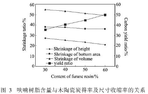 木陶瓷的底面積收縮率大于高度收縮率,因為木陶瓷成型采用的是單向加壓的方法,在高度方向受到較大的壓力,因此高度方向的致密度應(yīng)高于直徑方向的致密度,使得相同溫度下炭化分解引起的尺寸變化高度方向低于直徑方向;并且可以看出呋喃樹脂含量對木陶瓷底面積收縮率的影響不大,呋喃樹脂含量為30%時制得的木陶瓷底面積收縮率較大(379%l呋喃樹臘含量為700時制得木陶瓷的底面積收縮率較小(35.9%),兩者相差不到2%;而呋喃樹脂含量對制得的木陶瓷的高度收縮率的影響比較明顯,呋喃樹脂含量為30%時制得的木陶瓷高度收縮率較大(27.1%),呋喃樹脂含量為600時制得的木陶瓷度收縮率較小(20.7%),兩者相差6.4%??梢?,呋喃樹脂的炭化體積收縮率小于竹粉的炭化體積收縮率。