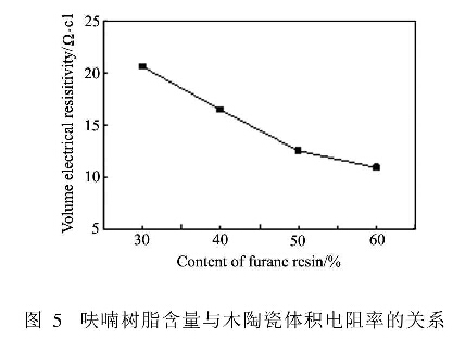 圖5為呋喃樹脂含量與木陶瓷體積電阻率的關(guān)系圖。由圖5可以看出,木陶瓷的體積電阻率與呋喃樹脂含量有關(guān),木陶瓷的體積電阻率隨著呋喃樹脂含量的增大而顯著減小。木陶瓷中電阻包含竹炭電阻、玻璃炭電阻、界面電阻三個部分,其中玻璃炭的電阻率遠小于竹炭的電阻率。隨著呋喃樹脂含量的增大,生成的玻璃炭的比例增大,與此同時,玻璃炭與竹炭界面增大(女口圖2所示),界面電阻率減小,因此使得木陶瓷總的電阻率減小。這與zhao等的研究結(jié)果一致,電阻率的大小與兩種組分炭的界面結(jié)合有關(guān),界面結(jié)合越強,意味著玻璃炭與多孔炭之間的接觸點越多,即電阻率越小,換句話說也就是生成的玻璃炭越多,電阻率就越小。